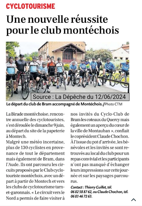 Articles de presse paru le 12/06/2024 dans La Dépêche du Midi et le 14/06/2024 dans Le petit Journal du Tarn-et-Garonne au sujet de la Birade montéchoise du 09/06/2024 organisée par les Cyclos Touristes montéchois (CTM).