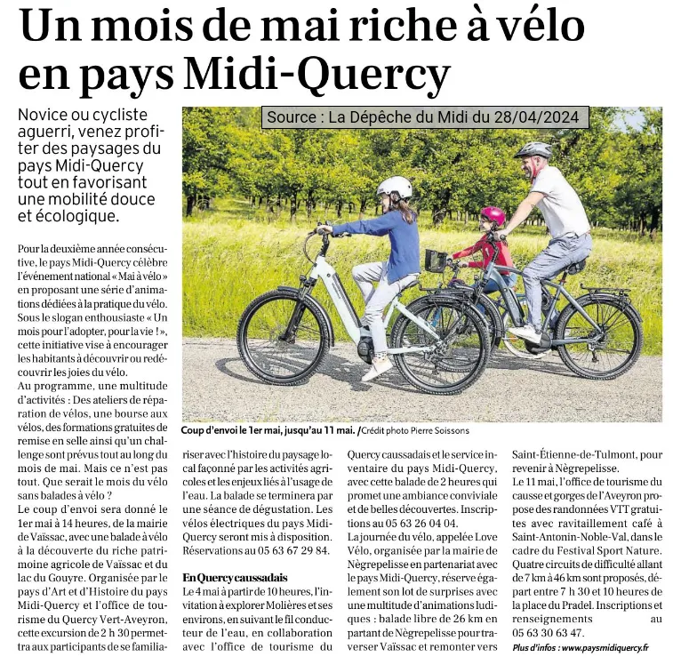 Article de presse paru le 28 avril 2024 dans La Dépêche au sujet de "Mai à vélo" dans la communauté de communes Pays Midi-Quercy.