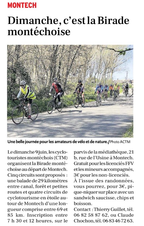 Article de presse paru le 05/06/2024 dans La Dépêche du Midi au sujet de la Birade montéchoise du 09/06/2024 organisée par les Cyclos Touristes montéchois (CTM).