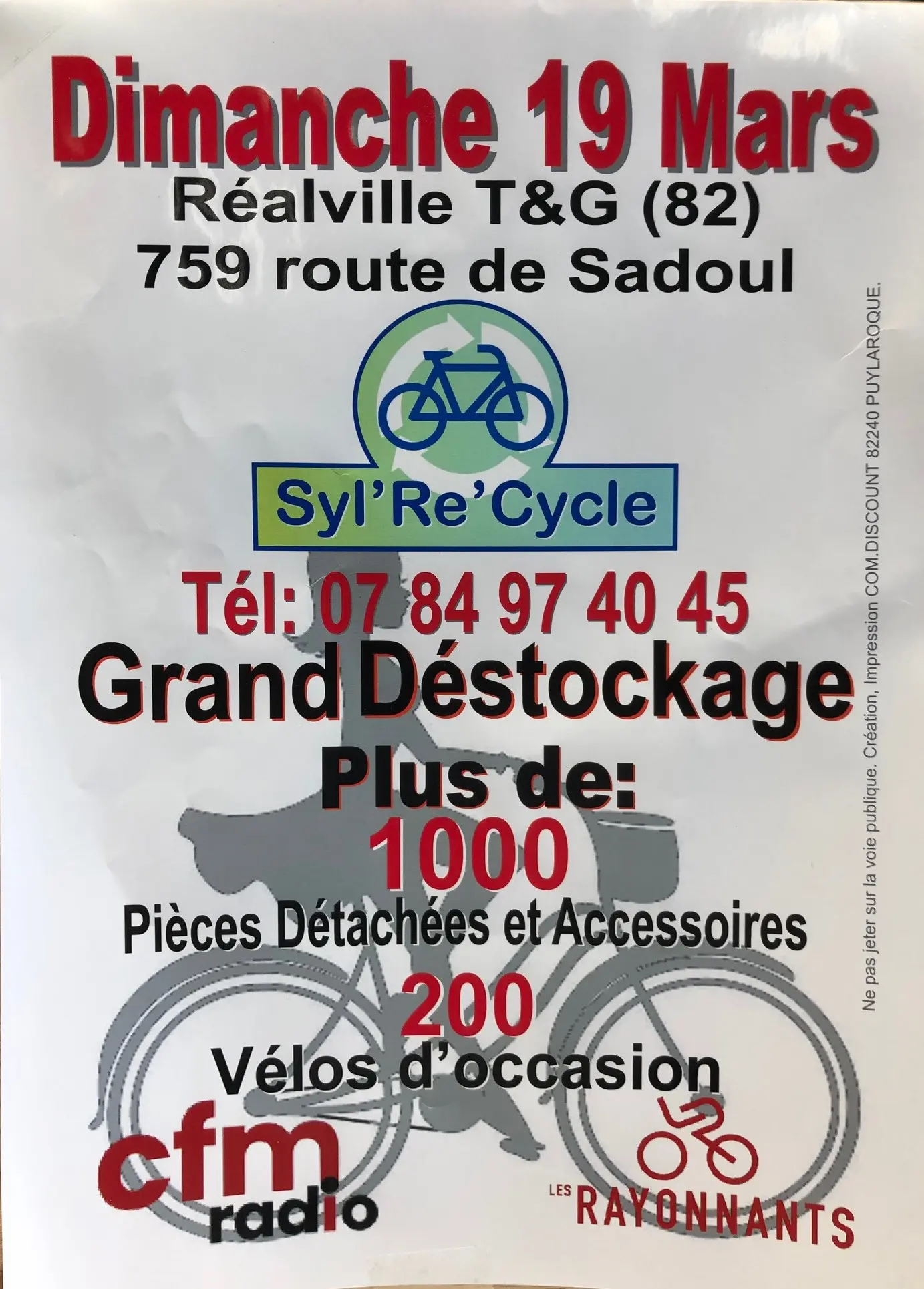 Annonce Syl'Re'Cycle Grand Déstockage, vélos d'occasion, pièces détachées et accessoires à Réalville (82) le dimanche 19 mars 2023.
